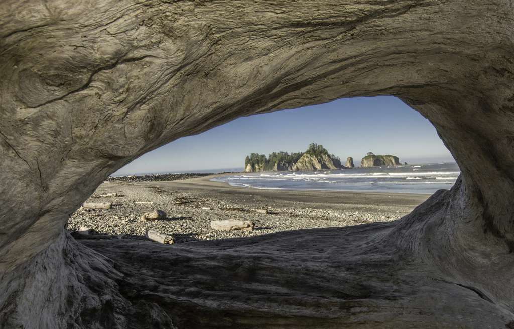 Rialto Beach: You park right at the beach at Rialto. This beach hides its beauty down the shoreline a mile at Hole in the Wall.This rock formation on the headland is the gateway to rock spires and some of the best tide pools along this coast at low tide.Looking south you can see more sea stacks and James Island that mark the town of La Push. Check the tides table as unwary hikers can get caught by the incoming waters that will block the path back to the parking area.