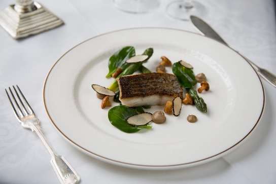 The spacious, candlelit, oak panelled dining room with its large, open fireplace, crisp white tablecloths and polished silverware, is a wonderful setting for a special evening meal.