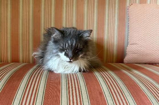 Susie, an exceptionally fluffy house puss 'number two' showed only a mild interest in us until we commandeered her spot on the sofa, then she came and sat right behind our heads, like a cat cushion!
