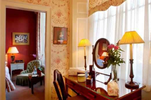 Our first-floor rooms, overlooking the lawns and Beech Avenue, had a real English feel with pink, patterned floral wallpaper, mahogany writing desk and green sofa.