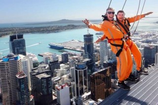 We take the elevator up to the 53nd floor of Sky Tower, the tallest building in the Southern Hemisphere, to walk outside on the 1.2 metre-wide metal grate that rings the highrise.