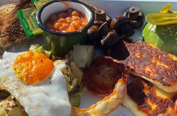 Bubble & Squeak, baked beans, fried egg, griddled halloumi and toast.
