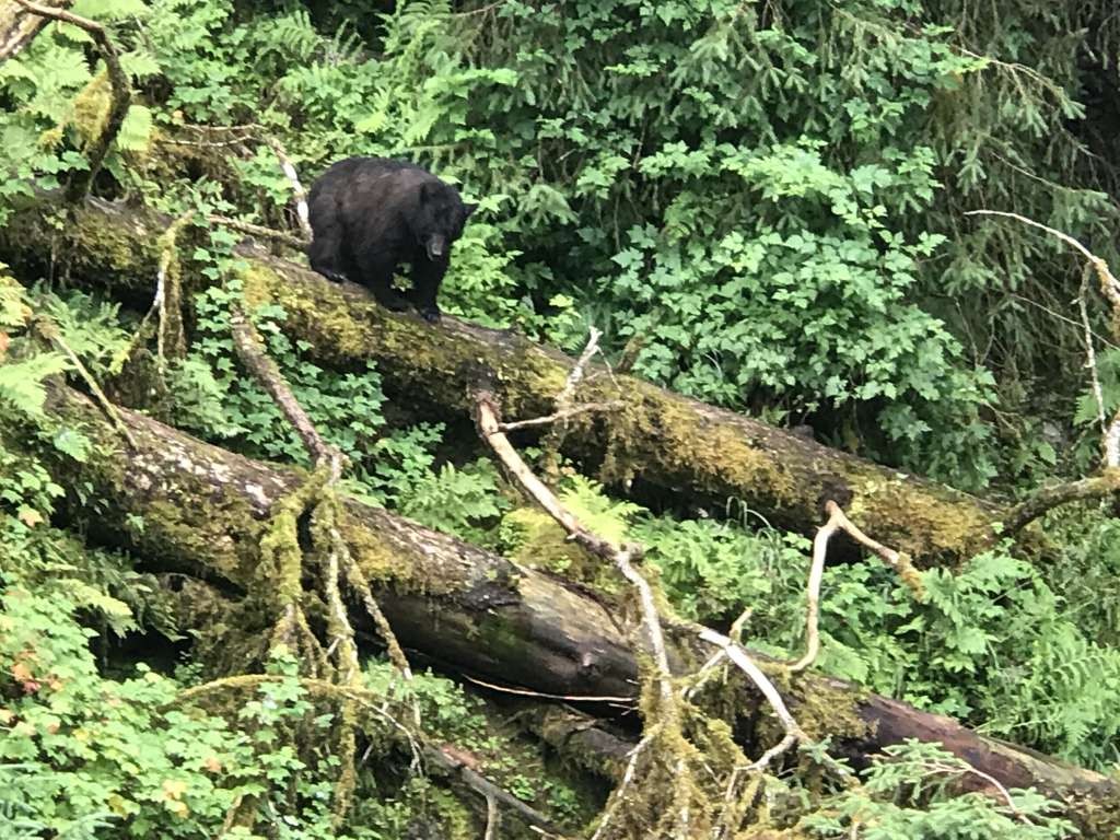 Anan is the only bear viewing place in Alaska where visitors can see both brown and black bears feeding in the same location at the same time. However, when I visited, when the brown bears arrived, the black ears scooted quickly away. Although the brown bears and the black bears co-exist, they do it from a sizeable distance.