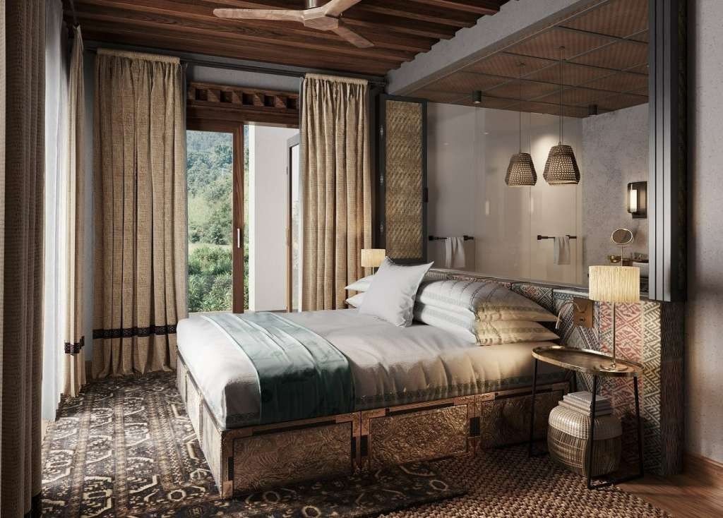The blue poppy, the national flower of Bhutan, also makes an appearance as a recurring theme woven throughout the interior design. Handwoven Bhutanese wool products are used as upholstery, linen detailing and blankets.