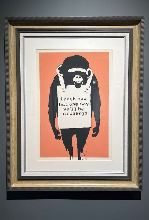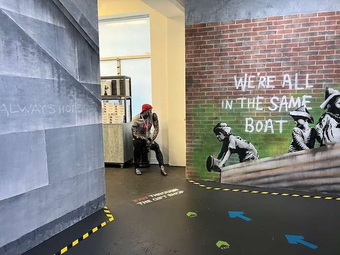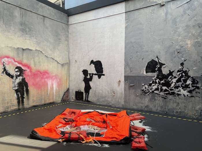 You may have seen Banksy work in situ before. You may have seen collections of Banksy or even visited his Walled Off Hotel in Paris.Here though, in the New York Banksy Museum you see a retrospective of sorts.The graffiti murals that are Banksy's stock in trade are displayed in such a way that none compete with the others. You feel like you are walking a maze of alleys all with the Banksy imprimatur.We saturate in Banksy irreverence.We linger with the detailing in the re-created Walled Off Hotel guest room—- thinking of the heavy US bombs now being deployed in Gaza and paid for with US tax dollars.