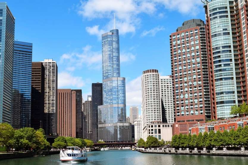 In between, are hundreds of other high rises making up a dense urban scene bisected by the Chicago River before it spills into ocean-like Lake Michigan.