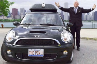 So, we all pile into the Mini Cooper to drive southeast through Chicago's famous skyscraper-choked downtown.
