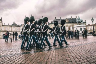 The Guard leaves its barracks at Rosenborg Castle, come rain, shine or snow, at 11.30am and marches through the city to Amalienborg Palace.