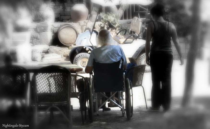 Lingering around the premises, we spotted a Philippine girl pushing a wheelchair in front of her. She stopped by the table where Rina welcomed us in the morning and topped over a little plastic bottle. A man in the wheelchair, staring ahead fixedly, opened his mouth to take a pill that turned up near his lips. When the girl left, we plucked up and came closer, from the side. "Good morning..." Squinting from the sun, Eli turned his head and mouthed a reply. Then his eyes travelled back to the fixed point ahead.