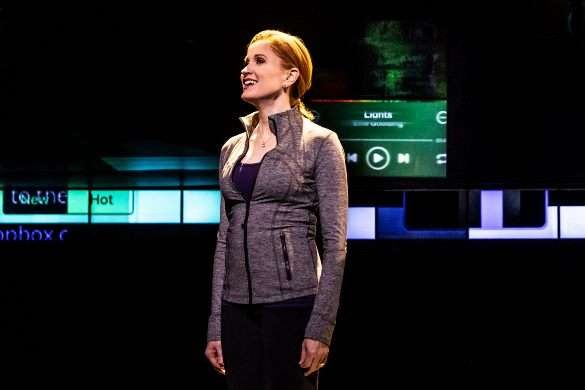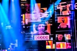 The staging, dominated by transient images of the social media age, sets the scene to a 'T'.