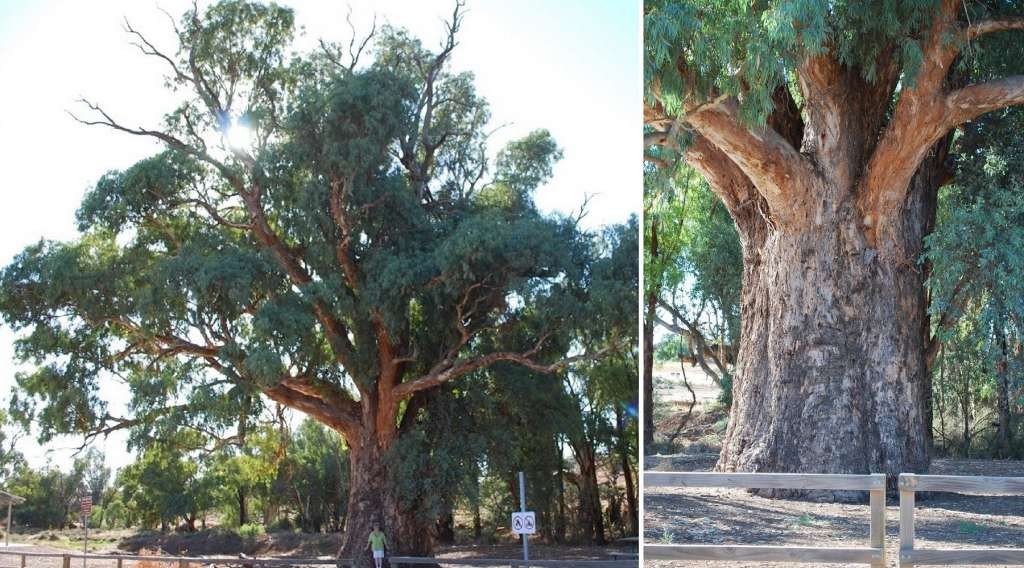 This magnificent example of a river red gum is estimated to be more than 500 years old. It is 10.4 metres or 34 feet in circumference, and it climbs six metres or 20 feet before there is a fork in the trunk.