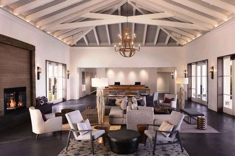 The hotel lobby enjoys a relaxed, coastal vibe created through spirited surf-inspired interior design, an open-air patio with firepits and elevated beach-chic dining.