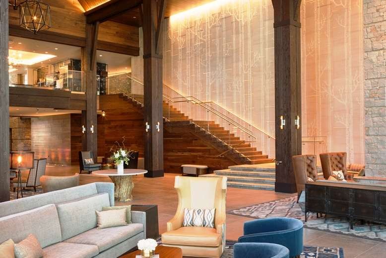 The lobby features handcrafted details, rustic touches and layering of wood tones, brushed metals and woven textures.