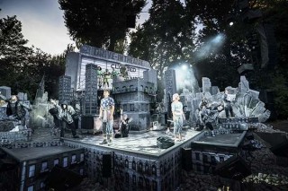 The stage is dominated by a huge, broken, once neon sign for a drive in movie declaring 'Closed – God bless America', surrounded by a montage of peeling skyscrapers and 'peopled by down and outs'