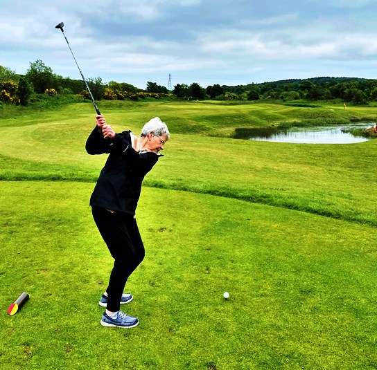 And my mom's first tee shot at the Devenick course at the Paul Lawrie Golf Centre in Aberdeen, Scotland gets nice air and distance to land – plonk – on the green 10 metres from the hole.