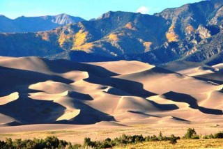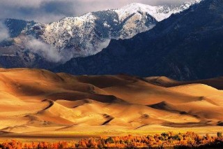 The park, which covers 40,000 acres and with the highest of the dunes reaching 750 feet, provides an unusual contrast to the snow-capped peaks.