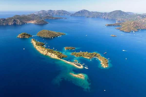 Near-shore islands are popular for day trips by boat, with the beach at Ölüdeniz in a sheltered by a lagoon and the nearby Butterfly Valley a designated nature reserve.