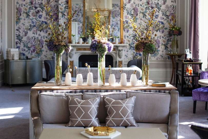 With its muted beige, green, tartan and plum colour scheme, floral wallpaper and upholstered chairs and sofas, the lounge chic, light and airy writes Ann Mealor.