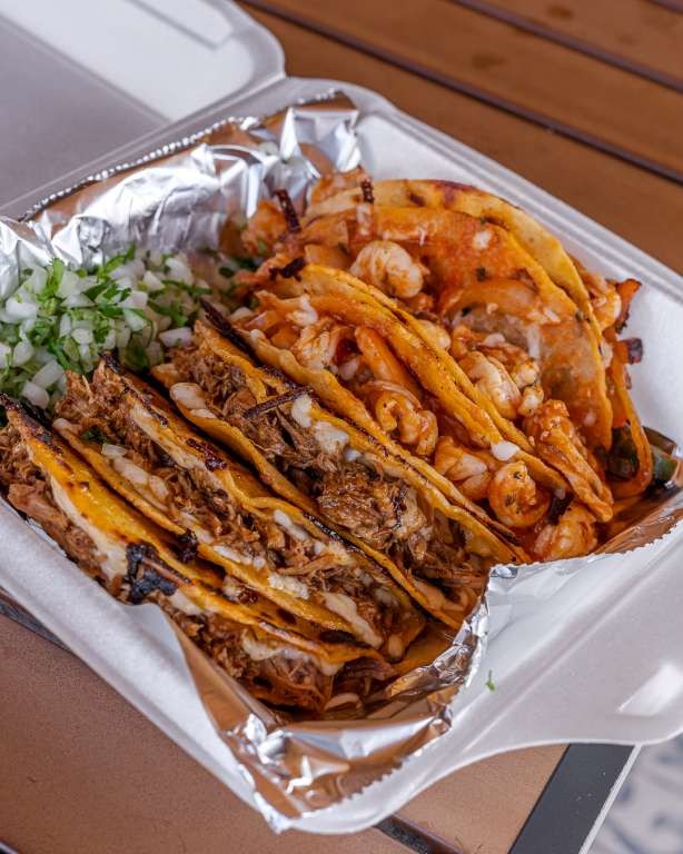 The El Jefe Plate - $24.99 - 3 shrimp tacos, 3 quesabirria tacos, choice of agua fresca is a favorite of mine. Quesabirria is a compound word combining queso (cheese) and birria, the traditional Mexican stew. What it is, basically, is a beef birria taco with melted cheese — a kind of cross between a taco and a quesadilla. The tacos are griddled crispy, and come with rich birria consomé broth for dipping.