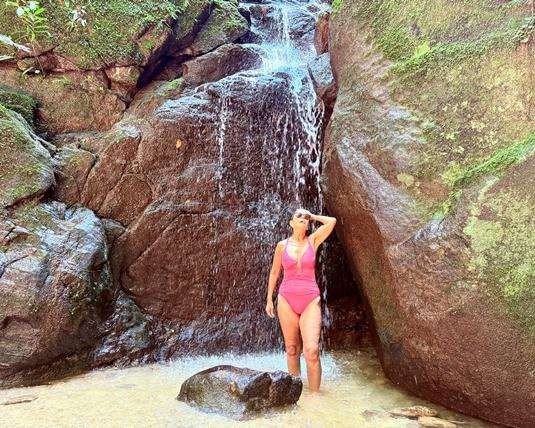 Just like the Baroness d'Escragnolle, my wife is luxuriating in the cascade of the waterfall.