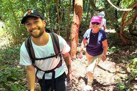 Pietro quips the hike is exercise and education, a free sauna (it's 31C and the humidity is off the charts) and then an exhilarating refresh in the waterfall.