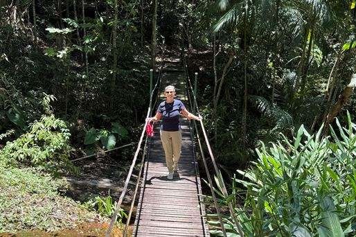 On the hike, Pietro points out the 1850-era Mayrink Chapel used by plantation owners, the ruins of plantation owners' manors, the native Pau Brazil, hollow Embuba and various palm trees alongside the invasive plants.