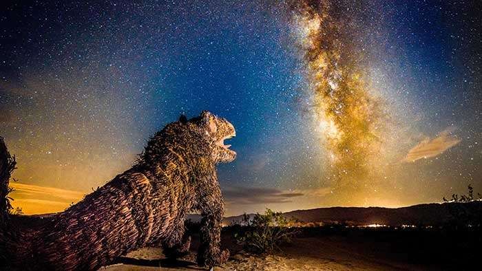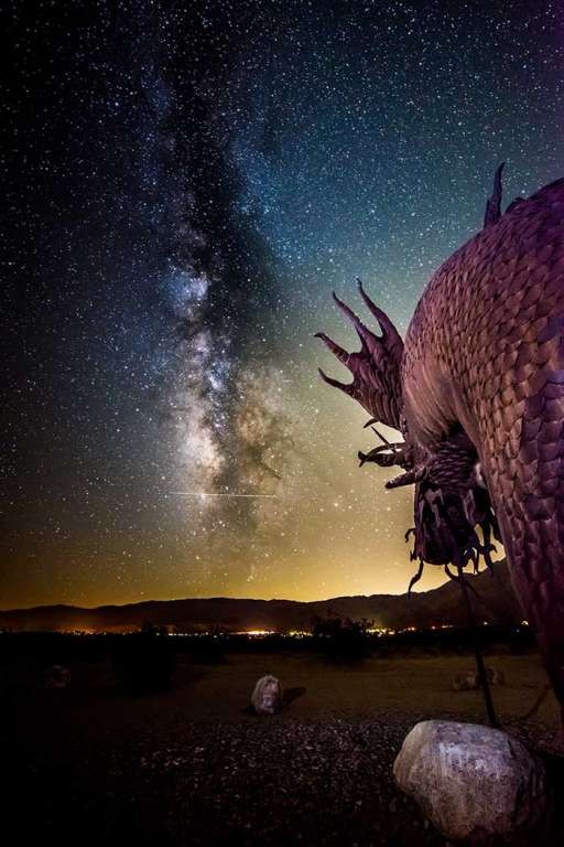 Arriving in Borrego Springs in the daytime is essential. I have to scout the sculptures. There are over 130 statues to choose from, as this prolific artist is given free rein to populate Galleta Meadows with his welded statuary.