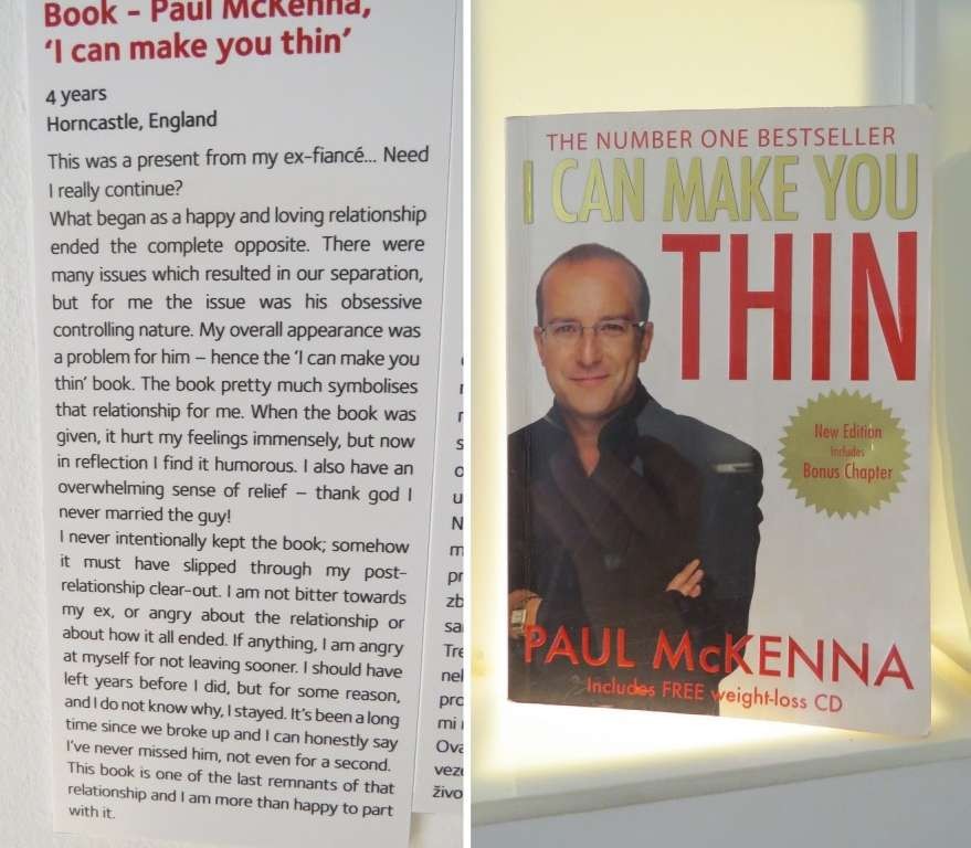 A letter from first loves parting ways in Sarajevo, Bosnia, on the brink of the war that broke up Yugoslavia recalls another romance that never stood a chance. Not all of the exhibits relate to failed love, some are just plain tragic. One such item is a parachute rig donated by a woman whose lover died in a skydiving accident. Then there is the following exhibit, which is self-explanatory.