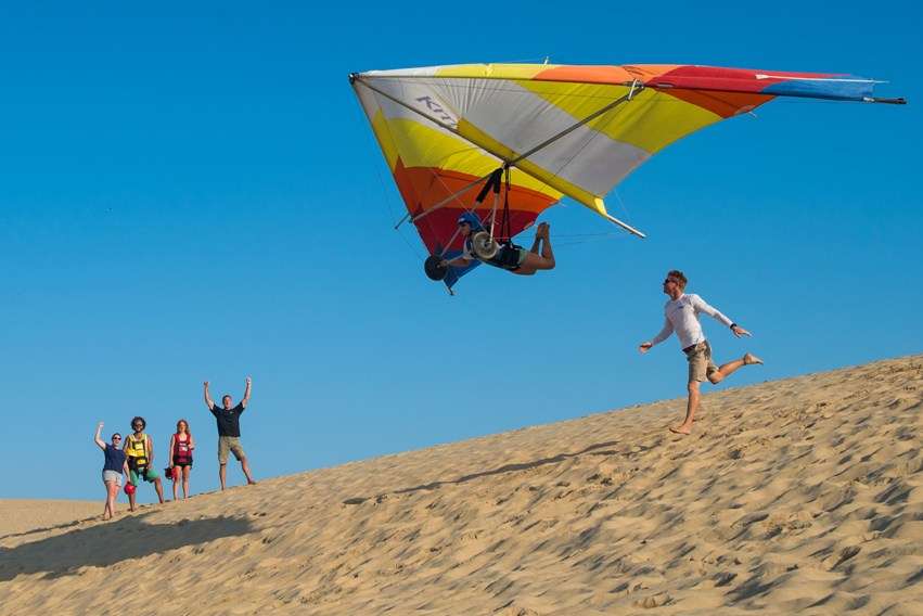 After a half-hour of instruction, we're running off the top of the main dune in the park until our feet leave the ground and we're flying.