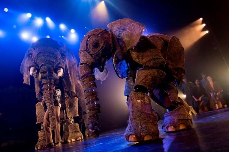 While the once used live animals are absent (thank goodness, we get Queenie and Peanut, two wonderful elephants in puppet form.