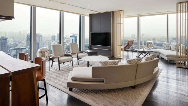 Guests can also enjoy deep-soaking marble baths and large flat-screen TVs with an integrated media hub, while rooms are adorned with classic Indonesian decorative objects from jewels to paintings and shields. The hotel's Presidential Suite covers an expansive 3,230 square feet (300 square meters) and has its own VIP entrance. The suite includes a spacious bedroom with an 82-inch LED TV and a living area anchored by a work desk made from solid Trembesi wood.