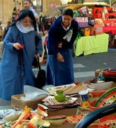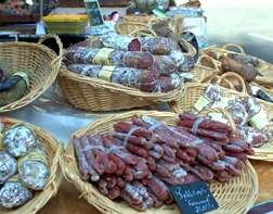 In des Prêcheurs, the antique and old book dealers are at the south end, in the middle are clothes and hats, china and baskets. Two nuns pick out some colourful Provencal bowls - they wear habits of lightweight denim (!) and one has a long black veil. Nearer the fountain are stalls selling local fruit and vegetables, breads, spices from the East, fragrant cheeses, and woody-smelling sausages.