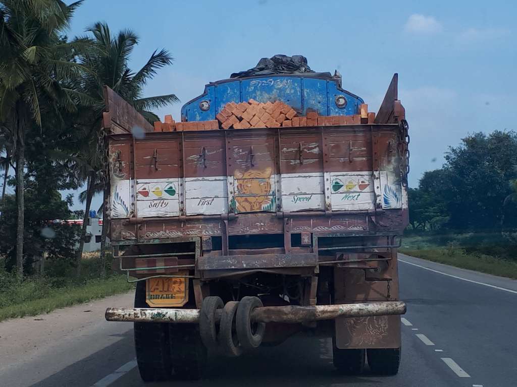 ‘Safty First’ – ‘Speed Next’ – The driver says with bricks unstacked and one step away from tumbling off the truck…