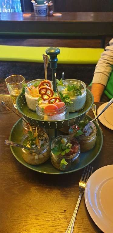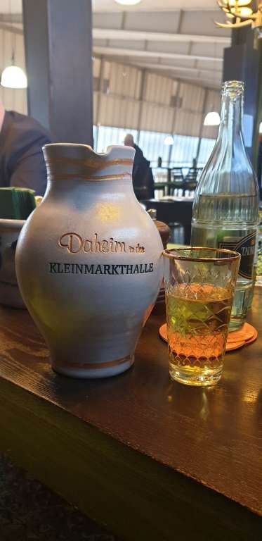 Lunch took us to Daheim in der Kleinmarkthalle at the summit of a Market Hall with over 100 food and drink stalls. It had the feel of a traditional inn, with its long benches in a no-frills environment. However, the provisions and beverages on offer were of sumptuous quality. One must try the local Apple Wine (Apfelwein), which is a gloriously refreshing Cider that is very easy to drink in high quantities! especially as it is drunk in conventional glasses you would drink water from. The platters provided combined all the culinary cravings one would wish to experience in Frankfurt as part of the Hessian cuisine. Many of the dishes infuse sauerkraut, fish, pork, onions, vinegar and most importantly Green Sauce (Frankfurter Grüne Soße). The latter comes with seven herbs including parsley and chives - suffice to say it is highly moreish.