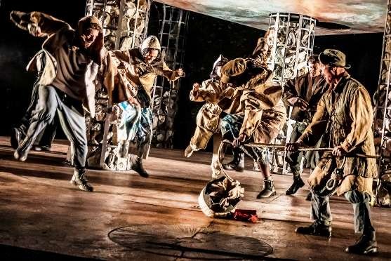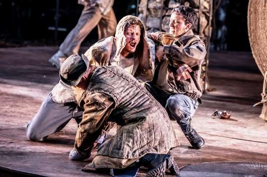 The scene is made more brutal, however, with a revolving stage that has rock filled wire columns and a rusting centrepiece.