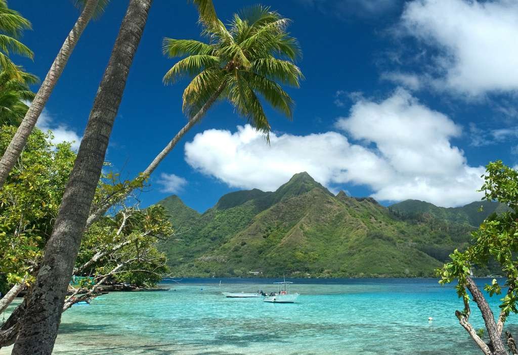 We sailed that evening for our nest stop of Huahine. A squall blew up that night and the bow of our ship bounced like a bucking bronco. My cabin was in the bow and every few minutes I was bounced up and down on my bunk with the motion of the ship.I finally had to ask for another cabin mid=ship to get some sleep. The water was to rough the next morning for the ship to make port at Huahine so we continued our cruise to our second stop on Moorea. Morning arrived with sunshine and puffy white clouds as we approached the anchorage on Moorea.