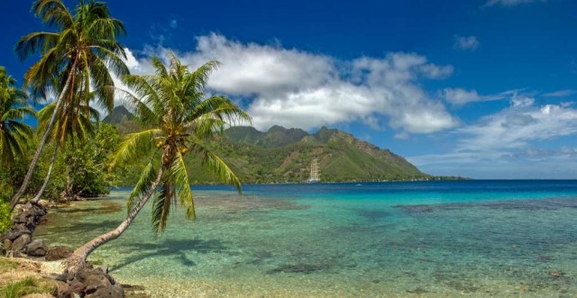 The Star Flyer anchored in Oponohu Bay beneath the green crags of the mountains. I arrived on shore by our red zodiac to spend my last day on the shores of this beautiful island. The palm trees lined the bay and small fishing boats were anchored in the shallows. I could see my ship across the bay. I could almost image it being H.M.S. Bounty or Captain Cook's Endeavour anchored there. The warm wind swayed the palms as I wandered the shoreline with my camera. I loved it when I found palm trees sticking out over the water.