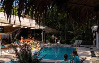 Rooms here are hidden out of view of the main areas, which boast a swimming pool, large bar/restaurant area with space to lounge, an open-air kitchen for self-caterers, a yoga deck, and then a space in the jungle where there are a series of glamping teepees that surround a fire pit.
