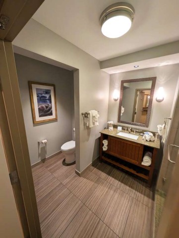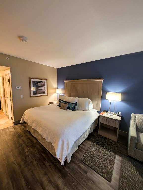 The rooms at the Chautauqua Harbor Hotel feel less like accommodations and more like a quiet continuation of the lake itself. Pale woods, soft blues, and maritime details echo the water just beyond the windows. Floor-to-ceiling sliding doors frame Lake Chautauqua like a living postcard. The beds invite lingering. Bathrooms are polished but practical. But the best part of the room is the private balcony; we stayed in room 338, which gave us a great view of both the lake and the outside bar and pool area. The pool is both recreational and reflective, inviting play and relaxation.