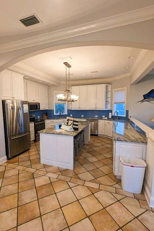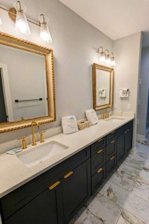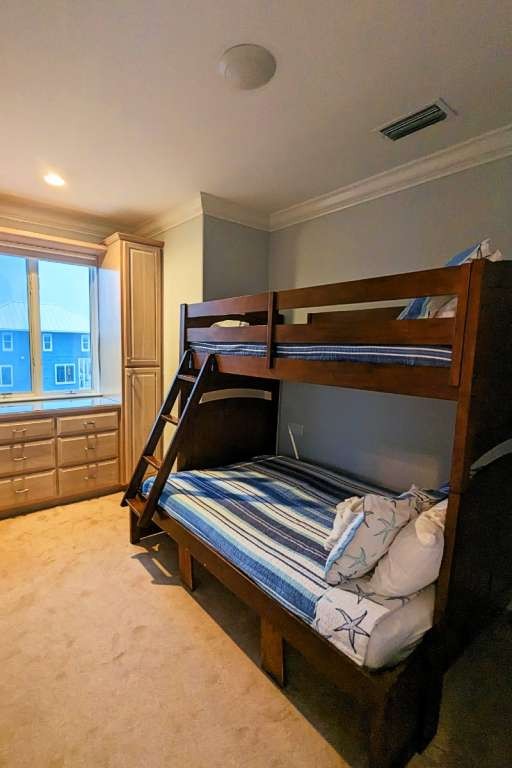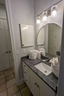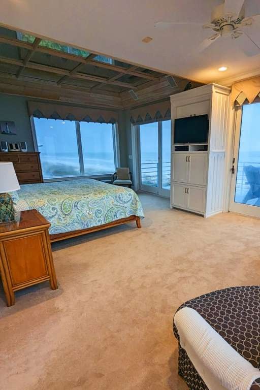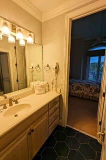 Having the entire house to myself, I chose to occupy the master suite, featuring a king bed with wrapping views of the Gulf of Mexico. The bedroom has a large, private balcony. Inside, there is a sitting area and desk near the gold accented bathroom with double vanity, large soaking tub, and walk-in shower big enough for two. I spotted some speakers, but I never took the time to get the music playing. The suite has plenty of drawer space and a walk-in closet.