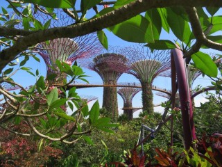 Across the harbor from the fountain is a strange looking building with what looks like a large ship sitting on the roof, otherwise known as Marina Bay Sands Sky Park. It was rather long walk across several bridges before we arrived and took an elevator to the top. What an amazing view of Singapore. I was especially interested in the hundreds of commerce ships anchored just outside the harbor. There were so many that a pilot boat would have to zigzag their way to the docks. This city nation has 5.6 million people all nestled into 137 square kilometers, so to house the people there are hundreds, maybe thousands of high-rise condos in every direction. After taking pictures we walked over to Gardens by the Bay, which contains the Guinness Book of World Record largest glass greenhouse. As you have already guessed Singapore is a garden paradise. Thirty percent Singapore's land has been filled in from the sea with most of it dedicated to parks and gardens, which also explains the "Garden City" knick name.