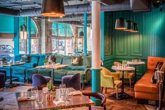 Decorated in blues and greys it is a cross between plush and warehouse, casual and formal, with its padded seats, exposed pipework, subtle lighting, bare marble top tables, linen napkins and silver cutlery.
