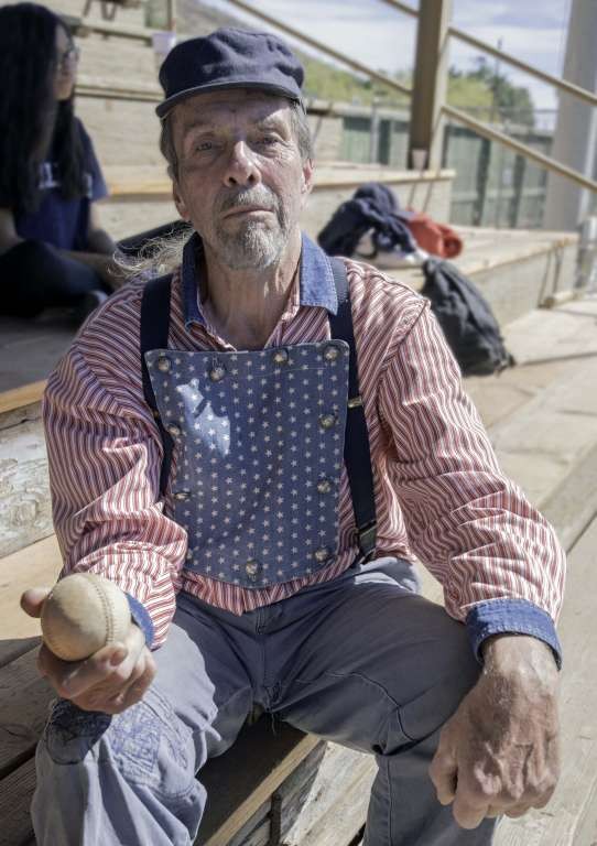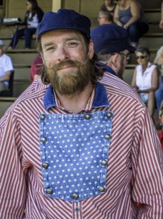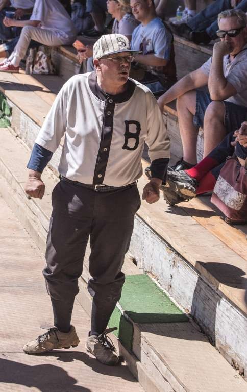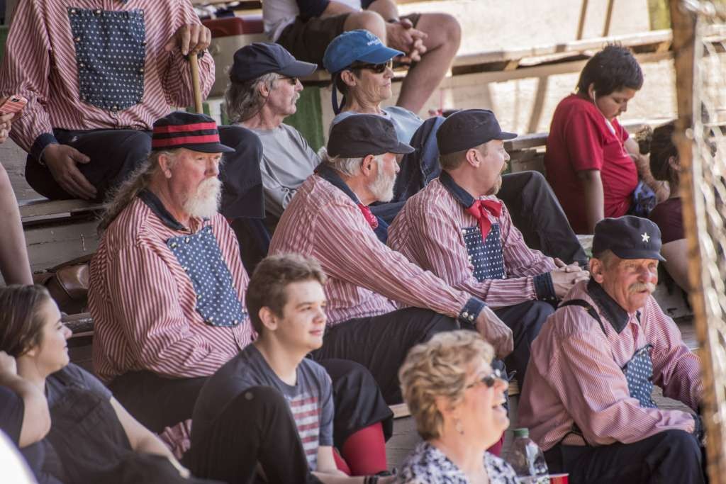 I watch a group of players sitting in the stands. They are the Colorado All-Stars who travel to Bisbee to play in the tournament.They will play the next game against the Bisbee Bees. The players have red striped shield shirts, blue Pill Box hats, and red socks.Most sport beards and/or handlebar moustaches. The Phoenix Senators wear white classic baseball uniforms with small classic caps. The Tucson Saguaros sport Ascot caps and Knicker trousers with knee high socks. The Bees are decked out in black and white classic uniforms with Bisbee printed across their chest.The appearance of the players really captures the look and feel of 1860 baseball. They are great to interact with and willingly pose for pictures.