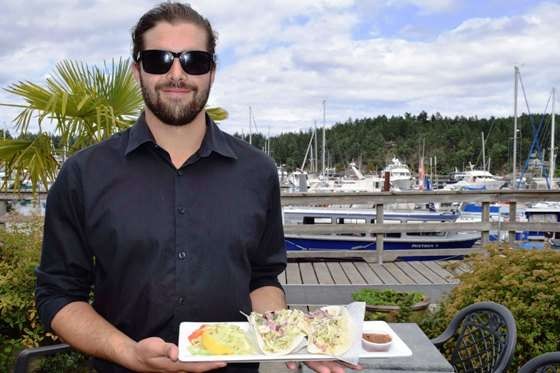We eat Pacific halibut fish tacos on the harbourside patio of Oystercatcher restaurant in the heart of Salt Spring's main village, Ganges.