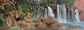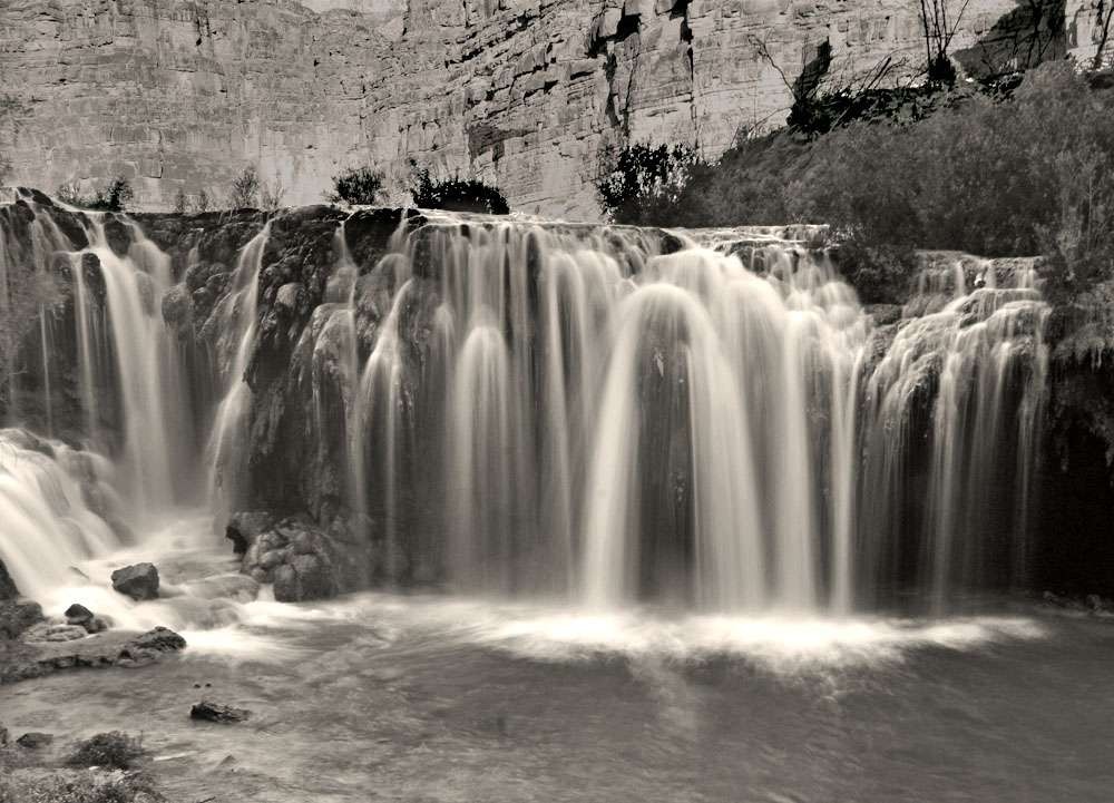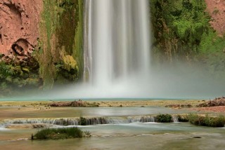 Before the sun rose the next morning we were up and strapping on our backpacks for our hike and descent to Mooney Falls. Mooney is the highest waterfall of Havasupai with a 200 ft drop from rim to pool. It is about a mile downstream from Havasu Falls as the river flows steadily downhill as its proceeds west to join the mighty Colorado several miles away. The hike was easy but the climb down the steep cliff side thru caves, steps carved out of rock, and clinging on to chains as your body hangs over sheer drops was stimulating to say the least. While a little scary no one has fallen off. Our oldest member was 80 years old and makes the descent and the ascent without incident. The fall roared at us as we reached the bottom.The power of water made the ground shake as we set up our tripods to capture its portrait.