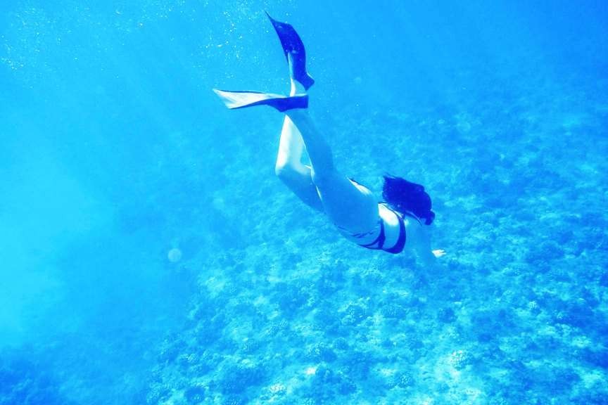 So, my wife, Kerry, and I and our 15-year-old daughter, Grace, grab the snorkel gear provided on the Hawaii Nautical catamaran tour and take the plunge.