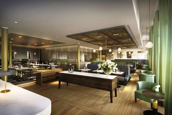 It has an imposing redbrick façade while inside a revamp of the original space sees restored columns, soaring ceilings, and wrought-iron marquees sitting side-by-side with original frescos painted by Adrian Karbowsky in 1910, mosaic tiled flooring, and tall arched windows.
