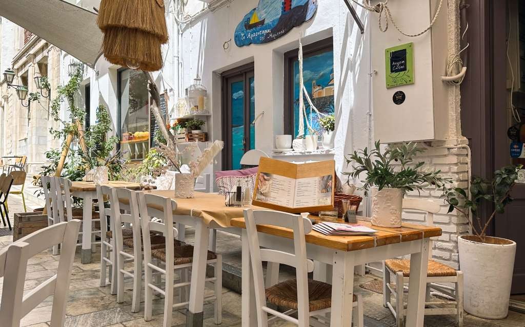On the second evening, we enjoyed dinner at To Plakostroto, a hilltop restaurant with stunning sunset views over the Aegean Sea. The food was exceptional, and the view was even better. After our early dinner, we strolled along the small alleys of Ai Michalis in search of great photo opportunities in the many ruins. We walked until we reached St. Michael's church. It is the tiniest whitewashed traditional church against the most pristine backdrop of the Aegean Sea and the perfect sunset. For all the Instagrammers out there, this is the spot to create exceptional content. From there, we went back to our car and headed to the village of Ano Syros for an evening cocktail at Theosis. This is one of the most charming locations in Ano Syros. They have unique cocktails with typical Greek associations like Apollo, Pothos, Thlipsis, Apatheia, etc.