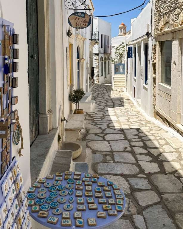 Today, this 102 km2, vibrant and cosmopolitan island is known for producing excellent wine (at one of the oldest vineyards in Europe). The island is also famous for icing-sugar-dusted loukoumi (similar in texture and taste to Turkish delight). You will find the most beautiful boxes filled with this delicacy in many of the shops in Syros. There is even a factory on the island that you can visit to learn how they make these sweet treats. If you have a sweet tooth like me, I can highly recommend also trying halvadopita (similar to nougat but sandwiched between wafers) and pastelaries (a kind of sesame health bar made of dried figs and almonds).