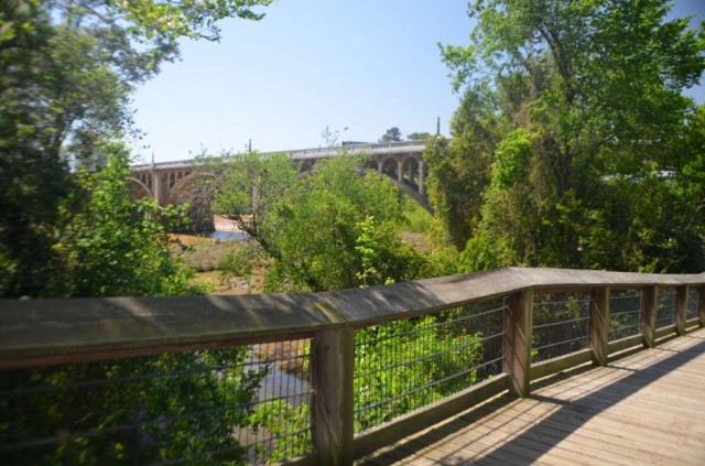 What better place for a stroll than along the Congaree River in West Columbia? With the picturesque Gervais Bridge and the cityscape of Columbia as the backdrop, visitors can choose to walk along the wooden boardwalk, or inch closer to nature on the dirt path close to the bank. Along the way are picnic tables, a riverside amphitheater, and a canoe launch bay. At the south end, the Columbia Riverwalk connects with the Cayce Riverwalk for those seeking an extended hike.